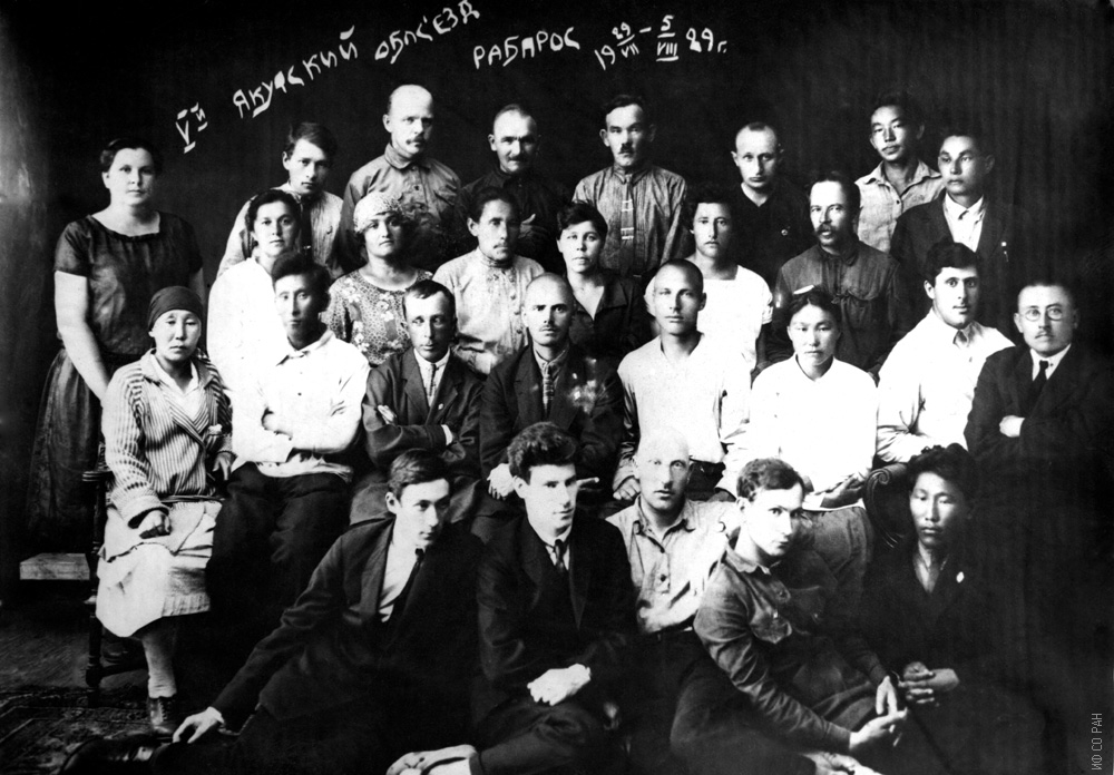 В 1929 году в Якутске проходил областной съезд работников просвещения. Академик Л.В. Киренский (сидит первый слева на полу), организатор и первый директор Института физики Сибирского отделения Академии наук СССР (ИФ СО АН СССР), среди участников съезда.