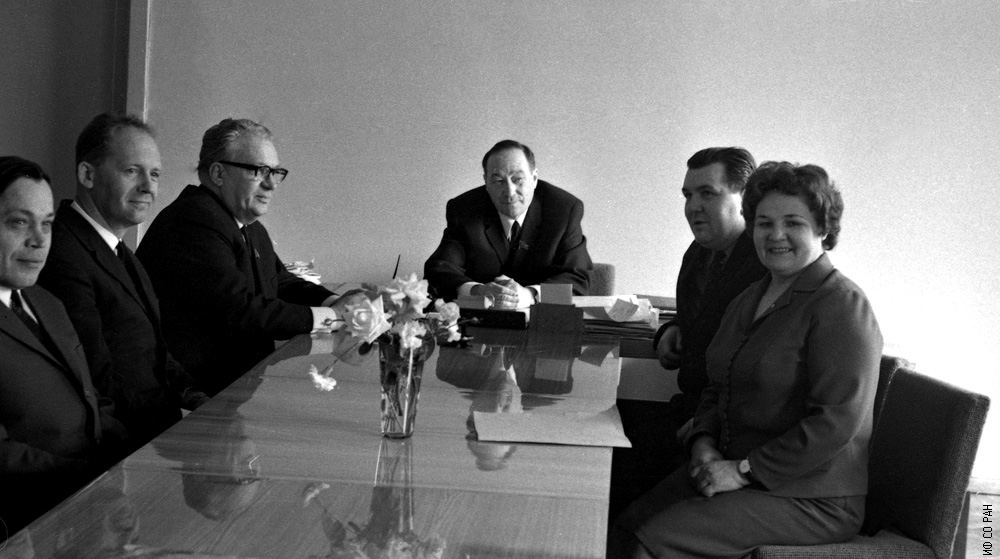 1962 год. Академик Л.В. Киренский, организатор и первый директор Института физики Сибирского отделения Академии наук СССР (ИФ СО АН СССР), в своем рабочем кабинете (в первом здании Института физики по проспекту К. Маркса, 42) с членами комиссии Сибирского отделения и Красноярского краевого комитета КПCС.