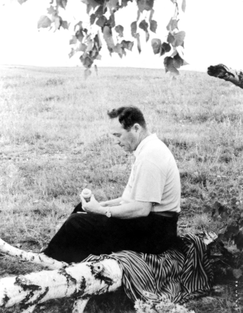 Академик Л.В. Киренский, организатор и первый директор Института физики Сибирского отделения Академии наук СССР (ИФ СО АН СССР), на прогулке в окрестностях Академгородка Красноярска, фото 1967 года.