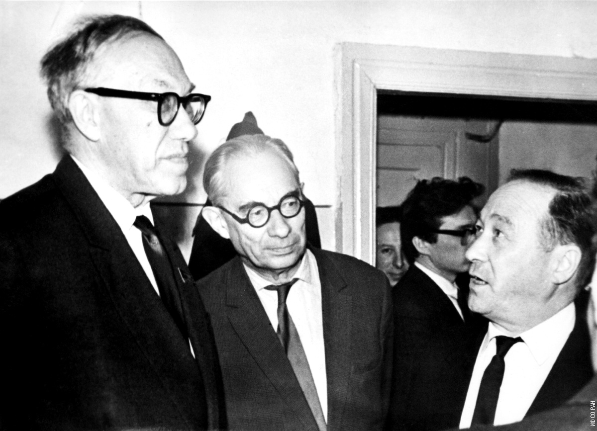Председатель Президиума Сибирского отделения Академии наук СССР М.А. Лаврентьев (слева) во время посещения Института физики Сибирского отделения Академии наук СССР в 1964 году. Справа - Л.В. Киренский, директор института.