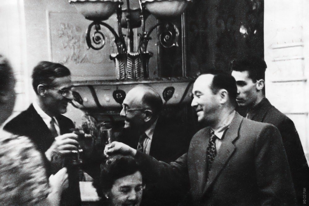 На приеме в честь участников Международной конференции по магнетизму в Москве. В центре американский магнитолог Р.М. Бозорт. Крайний справа академик Л.В. Киренский, организатор и первый директор Института физики Сибирского отделения Академии наук СССР (ИФ СО АН СССР). Снимок 1956 года.