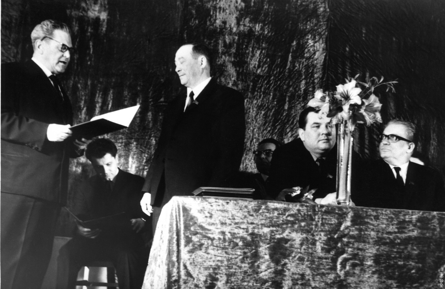 7 апреля 1969 года. Юбилей академика Л.В. Киренского, организатора и первого директора Института физики Сибирского отделения Академии наук СССР (ИФ СО АН СССР). Ему исполнилось 60 лет. Поздравляет юбиляра и вручает памятный адрес академик А.Б. Жуков, директор Института леса и древесины СО АН СССР. Красноярск.