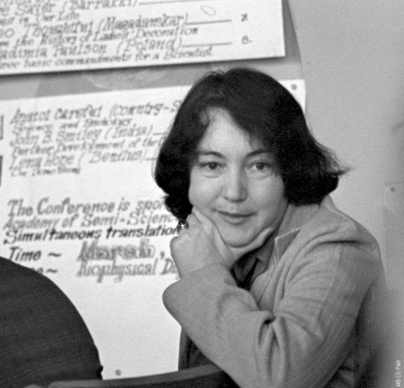 На снимке научные сотрудники лаборатории кристаллофизики Института физики им. Л.В. Киренского Сибирского отделения Академии наук СССР (СО АН СССР с 1991 года - СО РАН) Александрова И.П. (слева) и Зайцева М.П. в конференц-зале на обще институтском философском семинаре. Снимок 1972 года. Красноярск.