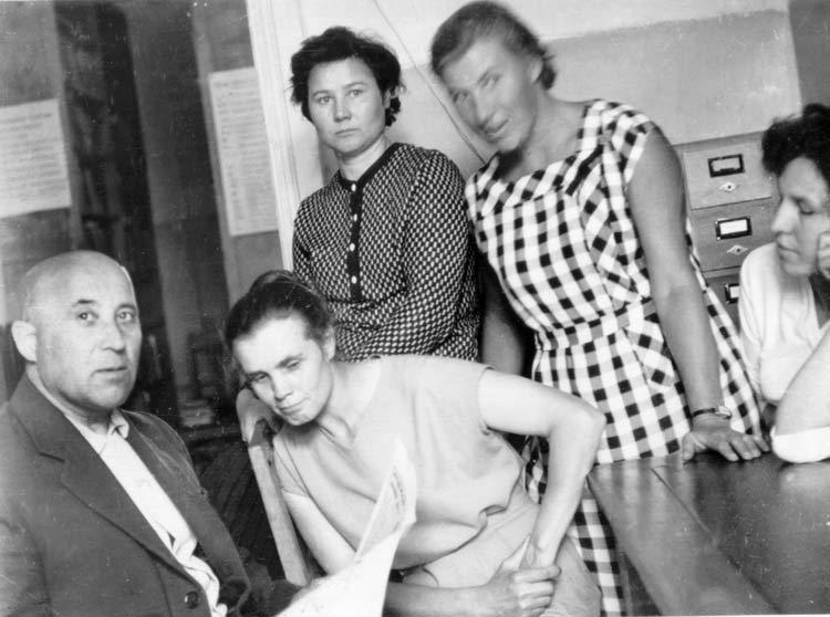 На снимке 1963 года сотрудники Института физики Сибирского отделения Академии наук СССР (ИФ СО АН СССР). В первом ряду сидят: Николай Гаврилович Воловенко, начальник первого отдела института, Полина Леонтьевна Власова, заведующая библиотекой. Во втором ряду (слева направо) коллектив библиотеки: Капиталина Ивановна Байкалова, Галина Алимовна Шугинина, Раиса Афанасьевна Андреева. Красноярск.