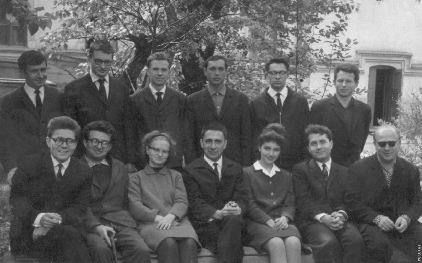 1967 год. Будущие доктора и профессора теоротдела Института физики Сибирского отделения Академии наук СССР. Сидят слева направо: Е.В. Кузьмин, Р.Г. Хлебопрос, Л.В. Михайловская, В.А. Игнатченко (руководитель отдела), Т.Я. Попова, Ю.В. Захаров, Ю.А. Куденко. Стоят слева направо: Г.В. Дегтярев, Л.М. Горенко, А.К. Попов, Н.Г. Сикилинда, Б.И. Баранцев, В.Е. Шапиро. Красноярск.