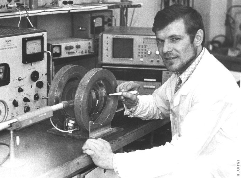 Борис Афанасьевич Беляев за установкой для исследования ферромагнитного резонанса в страйп-пленках в лаборатории физики магнитных пленок Института физики им. Л.В. Киренского Сибирского отделения Академии наук СССР (ИФ СО АН СССР). Снимок 1979 года. Красноярск.