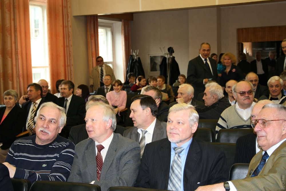 9 апреля 2009 года. Конференц-зал Института физики им. Л.В. Киренского Сибирского отделения Российской академии наук. Торжественное собрание, посвященное 100-ю со дня рождения академика Киренского Л.В., организатора и первого директора института. В первом ряду сотрудники института, слева направо: Исхаков Р.С., Вальков В.В., Беляев Б.А., Игнатченко В.А. Красноярск.