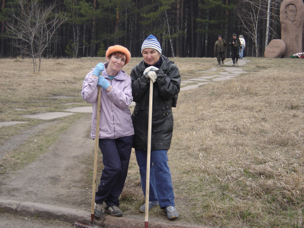 12 мая 2006 года. Традиционный весенний субботник по уборке территории. Бовина А.Ф. (слева) и Безотечество Г.Н., сотрудники лаборатории кристаллофизики Института физики им. Л.В. Киренского Сибирского отделения Российской академии наук (ИФ СО РАН), во время субботника. Красноярск.