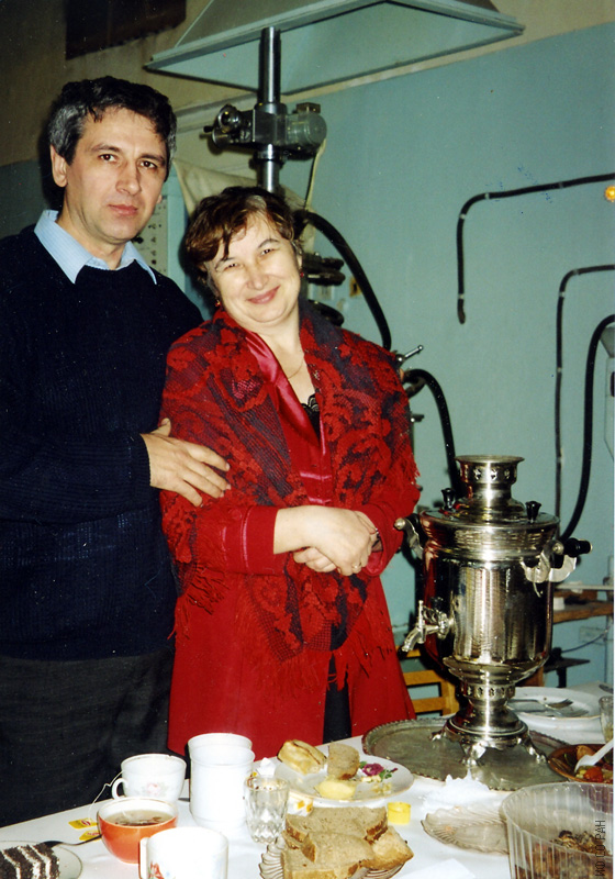 2009 год. В обеденный перерыв сотрудники лаборатории кристаллофизики Института физики им. Л.В. Киренского Сибирского отделения Российской академии наук (ИФ СО РАН) провожают масленицу (последний день зимы). Масленицу провожали с блинами, с пирогами, с самоваром. На фото Шолохов С.В. и Безотечество Г.Н. Красноярск.