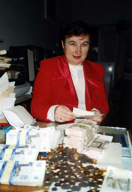 2001 год. Безотечество Г.Н. перед Новым 2002 годом выдает тринадцатую зарплату сотрудникам лаборатории кристаллофизики Института физики им. Л.В. Киренского Сибирского отделения Российской академии наук (ИФ СО РАН). Красноярск.