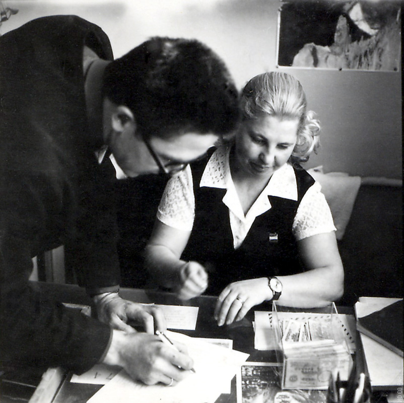 Муссонов В.М. и Чанчикова Н.С., сотрудники лаборатории кристаллофизики Института физики им. Л.В. Киренского Сибирского отделения Академии наук СССР (ИФ СО АН СССР), в день зарплаты. Фото 1974 года. Красноярск.