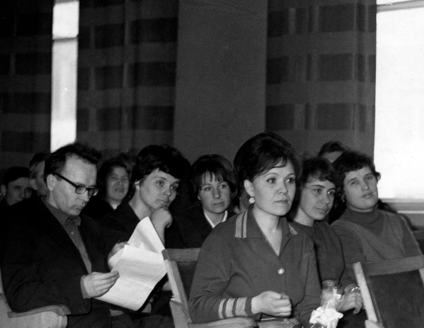 8 марта 1973 год. В актовом зале Института физики им. Л.В. Киренского Сибирского отделения Академии наук СССР (ИФ СО АН СССР) торжественное заседание, посвященное Международнму женскому дню 8 марта. В первом ряду, слева Носкова В.Ф., сотрудник экспериментальных механических мастерских. Во втором ряду Чихачев В.А., младший научный сотрудник лаборатории магнетизма горных пород и геофизики, рядом с ним Федосеева Н.В., младший научный сотрудник лаборатории резонансных свойств магнитоупорядоченных веществ. Красноярск.
