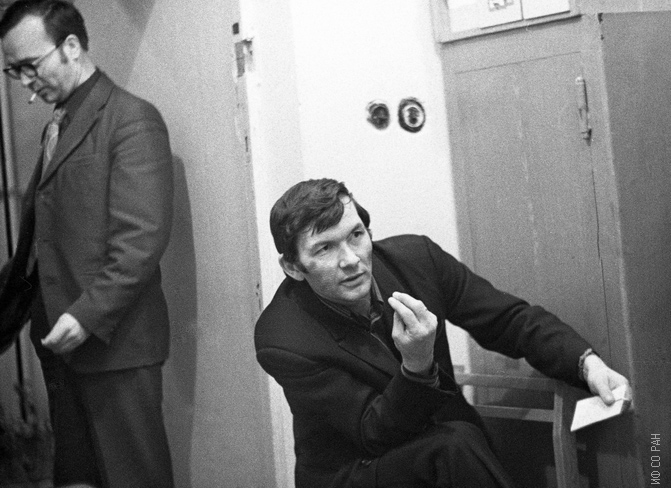 Сотрудники Института физики им. Л.В. Киренского Сибирского отделения Академии наук СССР (ИФ СО АН СССР) Чихачев В.А. (слева) и Баюков О.А. Фото 1974 года. Красноярск.