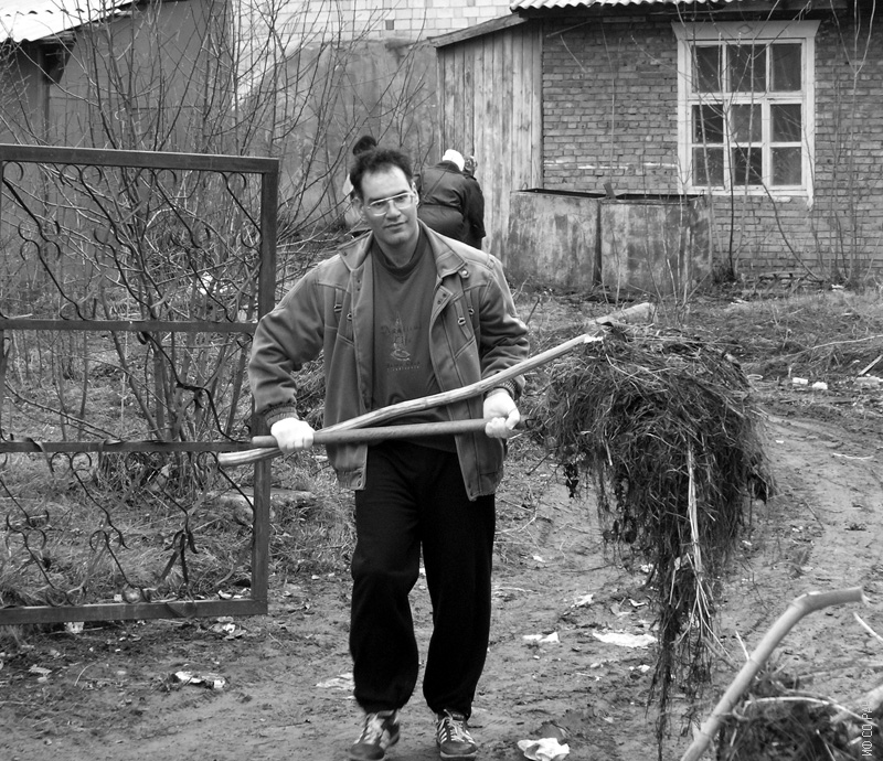 Дзебисашвили Дмитрий Михайлович, старший научный сотрудник лаборатории теоретической физики Института физики им. Л.В. Киренского Сибирского отделения Российской академии наук (ИФ СО РАН), специалист в области теории сильно коррелированных электронных систем, во время общеинститутского субботника на территории института. 2004 год. Красноярск.