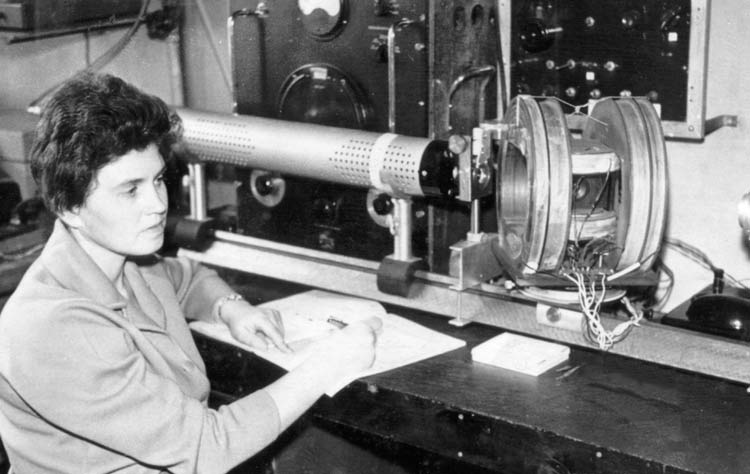 Эдельман Ирина Самсоновна, младший научный сотрудник лаборатории физики магнитных явлений Института физики Сибирского отделения Академии наук СССР (ИФ СО АН СССР), за установкой по исследованию квазистатических петель гистерезиса эпитаксиальных магнитных пленок, фото 1963 года. Красноярск.