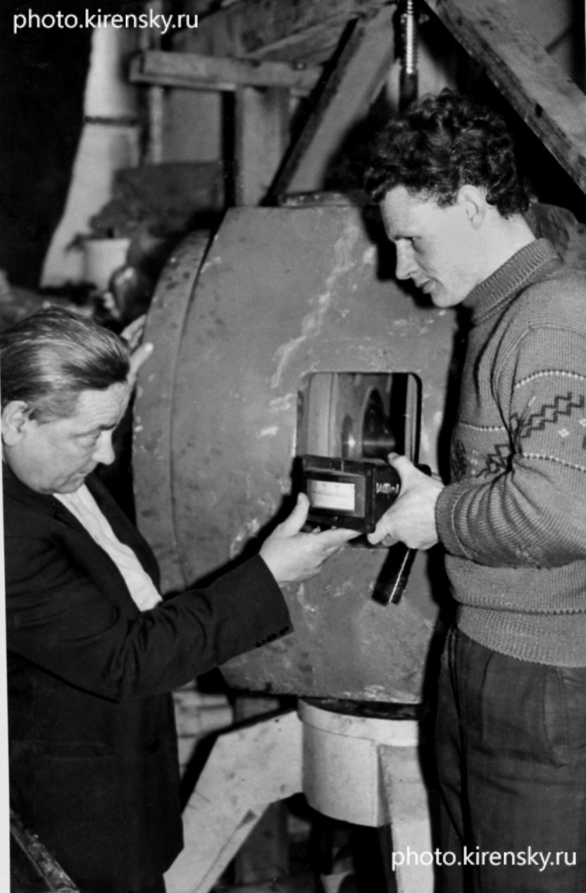 1967 год. Сотрудники лаборатории структурных свойств тонких магнитных плёнок Института физики Сибирского отделения Академии наук СССР (ИФ СО АН СССР) (СО АН СССР с 1991 года СО РАН) Ендржеевский В.Ю. (слева) и Бурлаков В.В. у сконструированного ими магнитометра. Красноярск.
