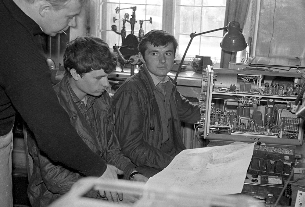 Сотрудники бюро контрольно-измерительных приборов (бюро КИП) Института физики Сибирского отделения Академии наук СССР (ИФ СО АН СССР), слева направо: начальник бюро Ермилов В.П., лаборант Жигаев Г.М., инженер Михальский В.И., фото 1969 года. Красноярск.