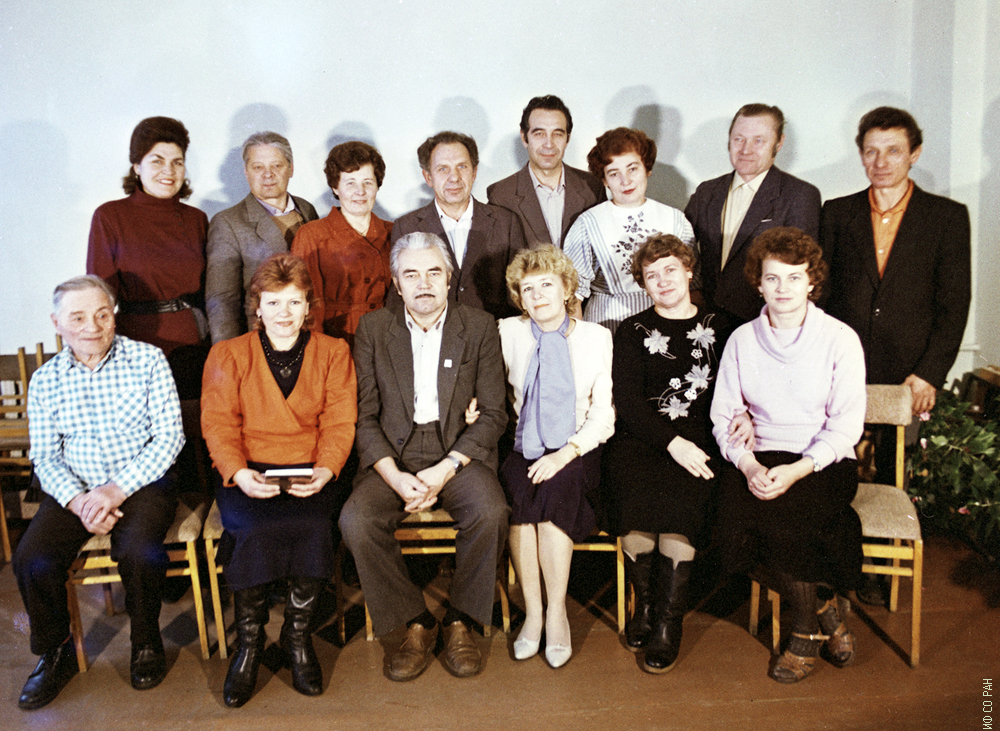 Сотрудники экспериментальных механических мастерских Института физики им. Л.В. Киренского Сибирского отделения Академии наук СССР (ИФ СО АН СССР). Сидят, слева направо: Федоров А.А., Нечаева Т.Р., Кривов Ю.С., Машинцева Л.Д., Носкова В.Ф., Меньшикова Т.И. Во втором ряду стоят (слева направо): Катцина Л.А., Артемкин А.С., Артемьева Г.И., Ростовцев П.Г., Кропачев Г.Д., Манько П.И., Шахматов В.Н., Янковский Л.А. Фото 1981 года. Красноярск.