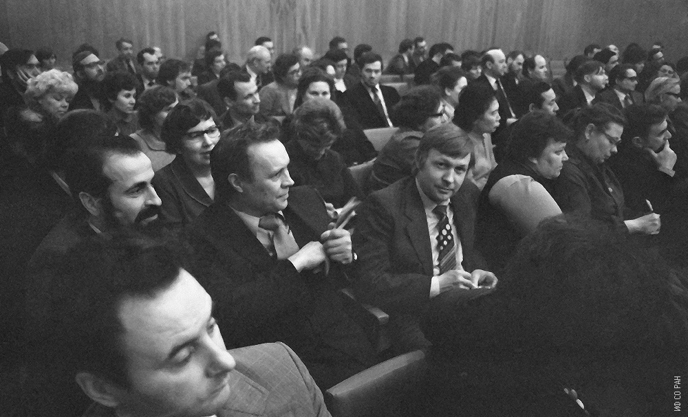 В конференц-зале Института физики Сибирского отделения Академии наук СССР (ИФ СО АН СССР) на специализированном Совете по защите диссертаций. Сотрудники института, слева направо: Кузнецов Н.Ф., Фиш А.М., Якубайлик Э.К., Поцелуйко А.А, фото января 1970 года. Красноярск.