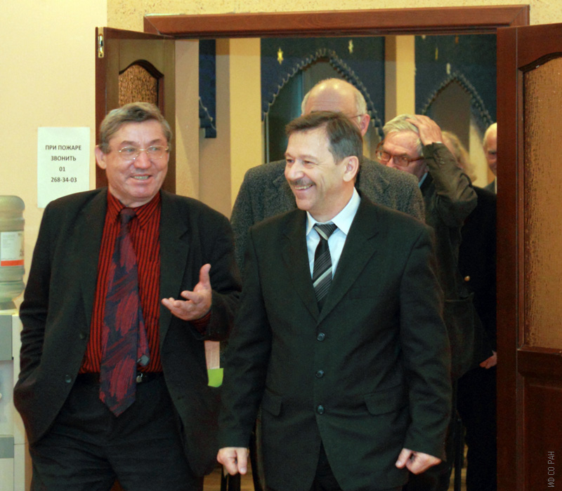 Шапарев Н.Я. (слева), Гуняков В.А., на семинаре отдела оптики Института физики им. Л.В. Киренского Российской академии наук (ИФ СО РАН), посвящённом 100- летнему юбилею Коршунова А.В., организатора и руководителя, долгие годы, отдела оптики института. Академгородок Красноярска, Дом ученых, январь 2011 года.