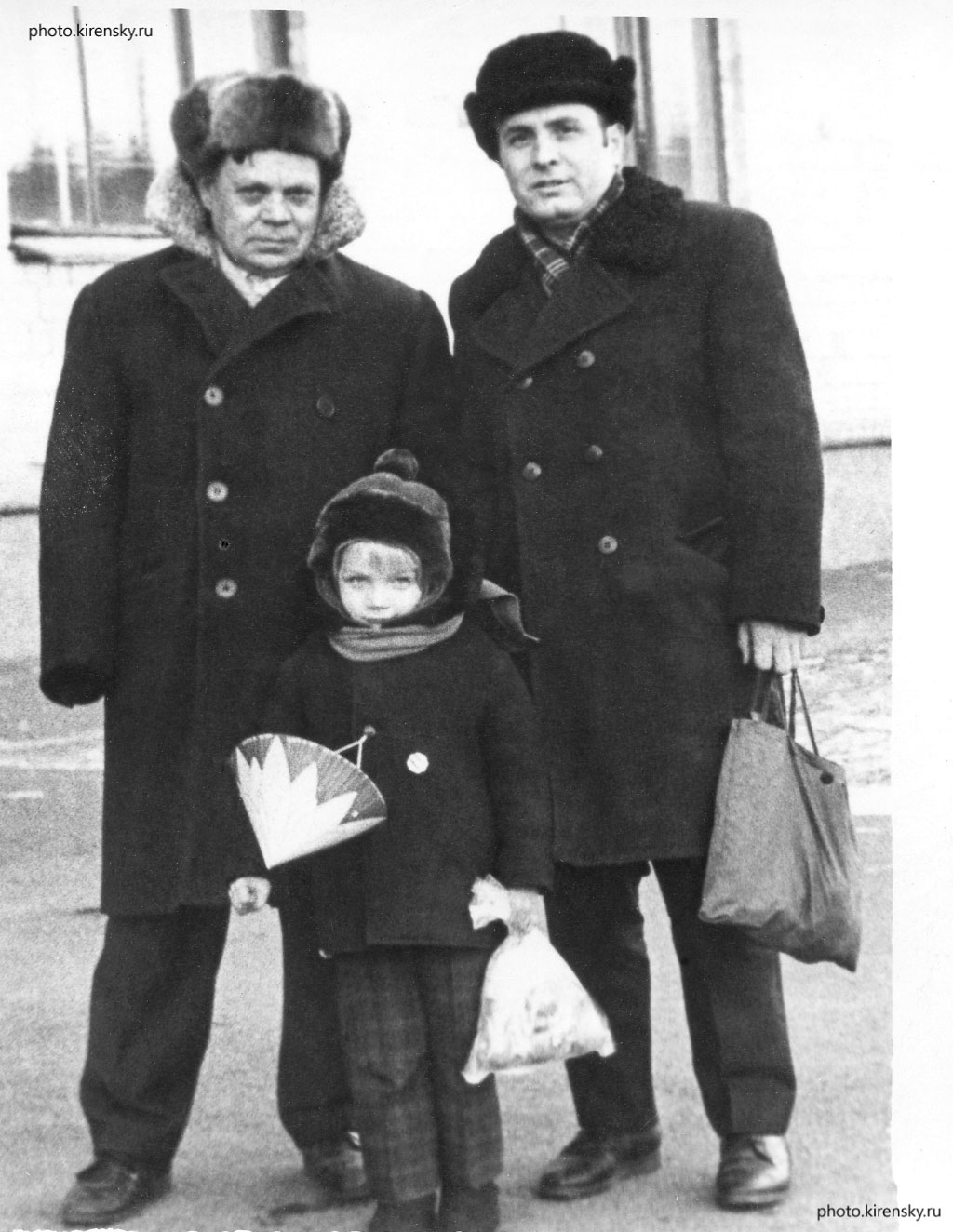 Руководитель участка оперативной полиграфии Института физики им. Л.В. Киренского Сибирского отделения Академии наук СССР С.Ф. Холкин (слева) и старший научный сотрудник теоретического отдела института Захаров Ю.В. у здания института в 1974 году.