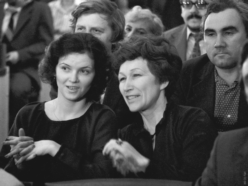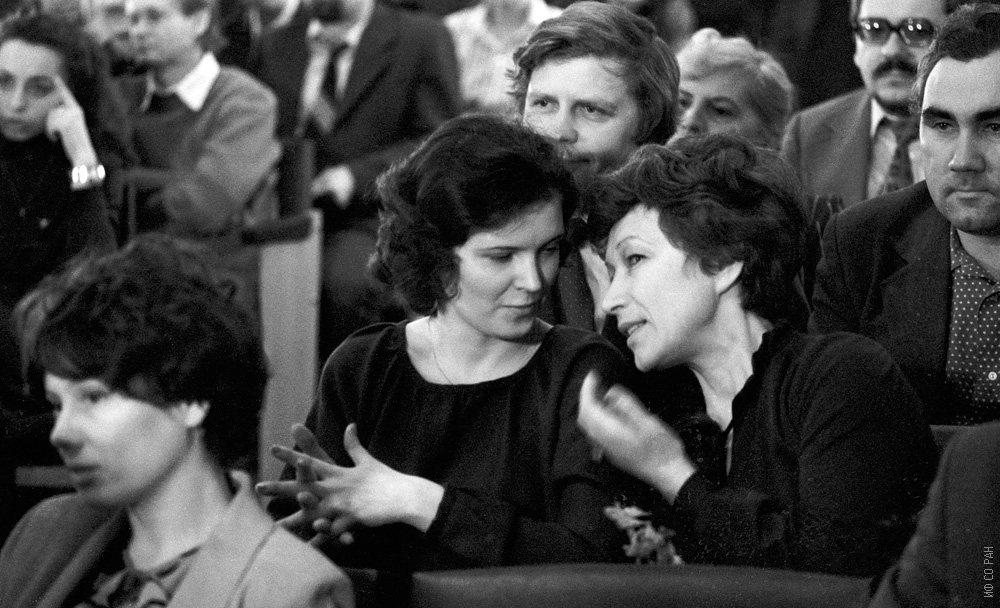 1984 год. Конференц-зал Института физики им. Л.В. Киренского Сибирского отделения Академии наук СССР (ИФ СО АН СССР). В первом ряду - Буркова Л.В. Во втором ряду -Ольга Зубарева (слева), собственный корреспондент газеты "Наука в Сибири" и Л.М. Хрусталева на заседании расширенного ученого Совета института, посвященного памяти академика Л.В. Киренского. Красноярск.