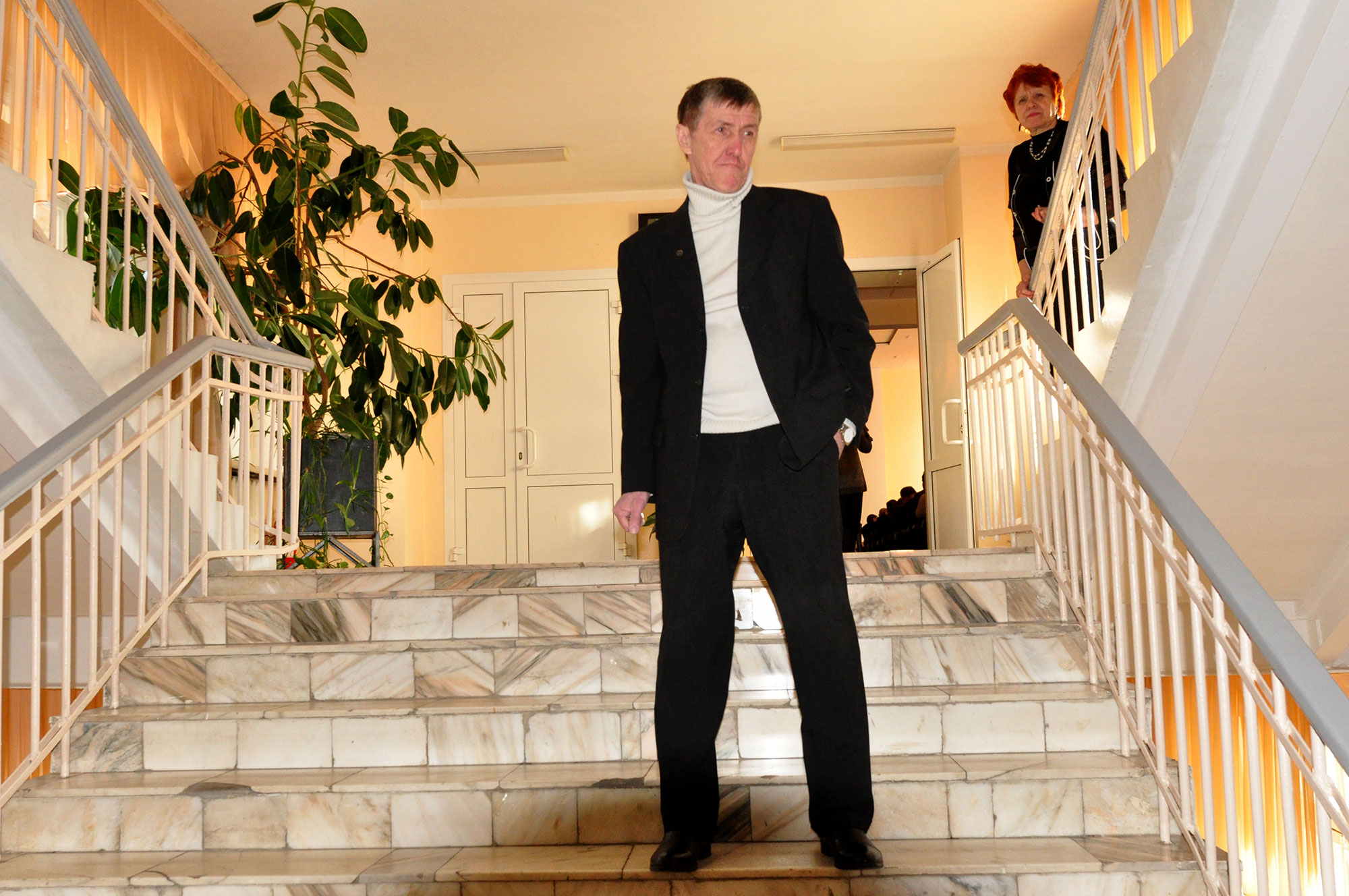 2015 год. В холле Института физики им. Л.В. Киренского Сибирского отделения Российской академии наук (ИФ СО РАН) Агапов А.В., заместитель директора по административно-хозяйственной работе и Кармацкая Е.Д, комендант главного корпуса института. Красноярск.