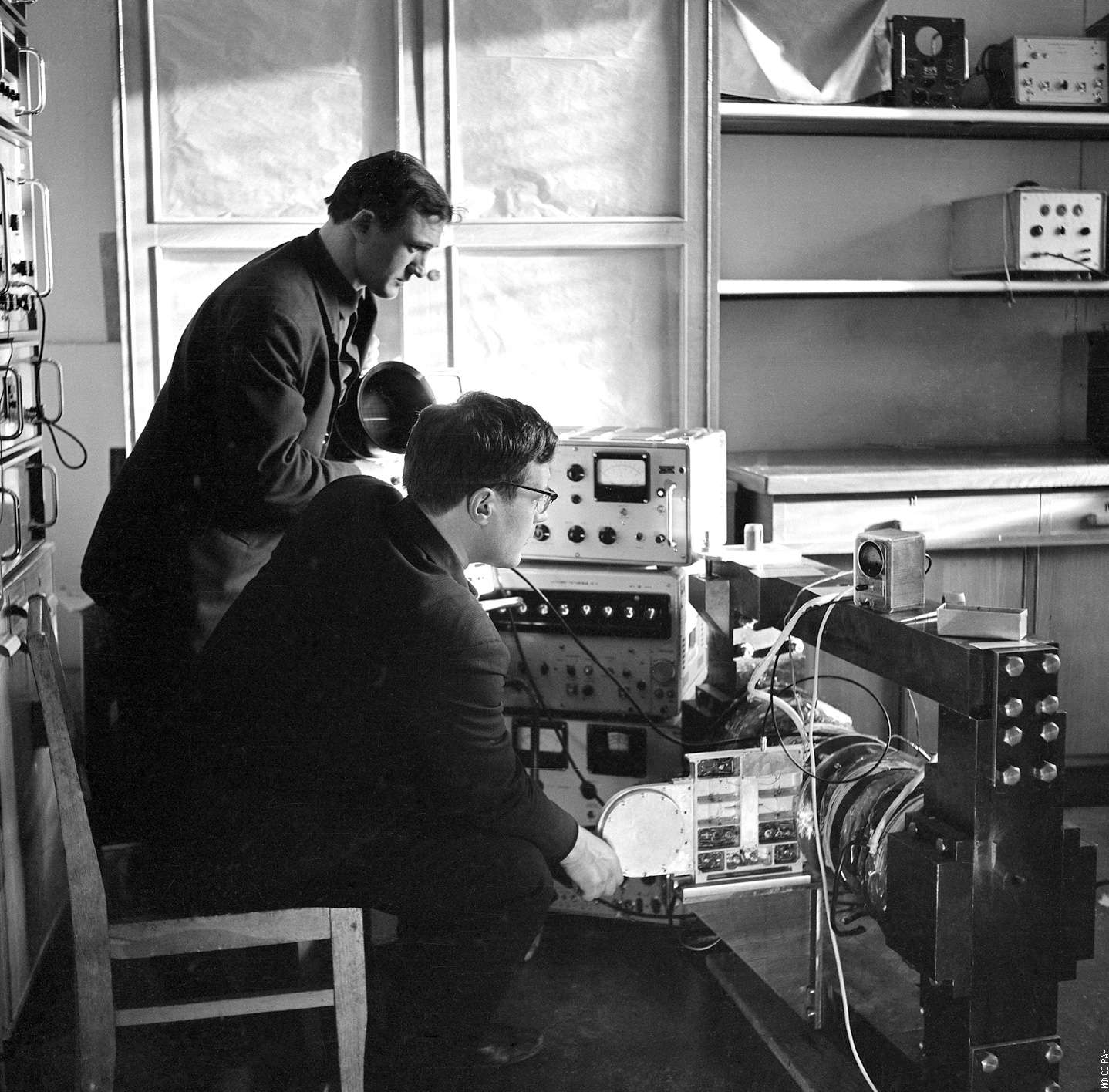 1972 год. Владимиров В.М. (слева) и Кашкин В.Б., сотрудники лаборатории радиоспектроскопии Института физики им. Л.В. Киренского Сибирского отделения Академии наук СССР (ИФ СО АН СССР), за настройкой аппаратуры, разработанной и изготовленной в институте. Красноярск.