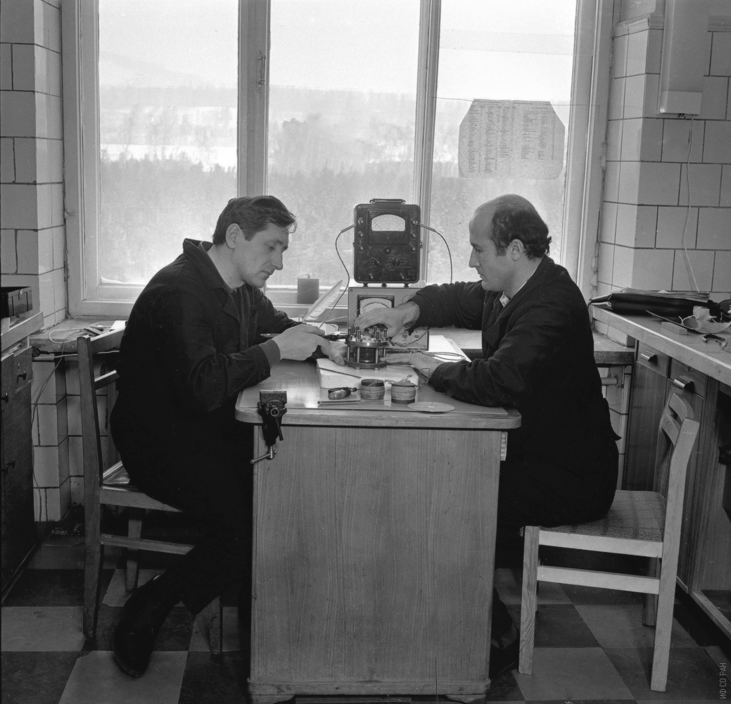 Кочаров Н. Г. (слева) и Катрухин Ю. К., сотрудники лаборатории сильных магнитных полей Института физики им. Л.В. Киренского Сибирского отделения Академии наук СССР (ИФ СО АН СССР), в конференц-зале института на общеинститутском методологическом семинаре, фото октября 1978 года. Красноярск.