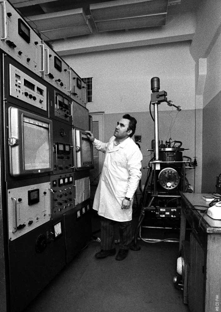 1967 год. В.П. Кононов, ведущий инженер лаборатории высокочастотных и импульсных свойств тонких магнитных пленок Института физики Сибирского отделения Академии наук СССР (ИФ СО АН СССР) (СО АН СССР с 1991 года СО РАН), за вакуумной установкой УНУ-1 для напыления пленок. Красноярск.