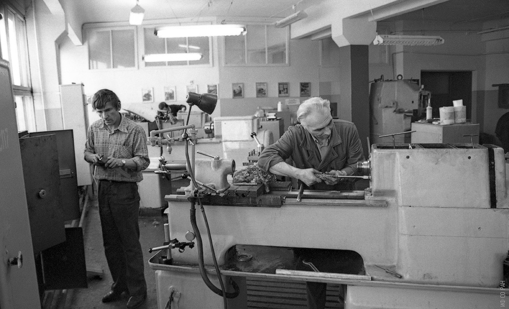 Коротких Илья Тимофеевич (слева), окончил Красноярский машиностроительный техникум, токарь экспериментальных механических мастерских. Считался мастером на все руки. Фото 1983 года.