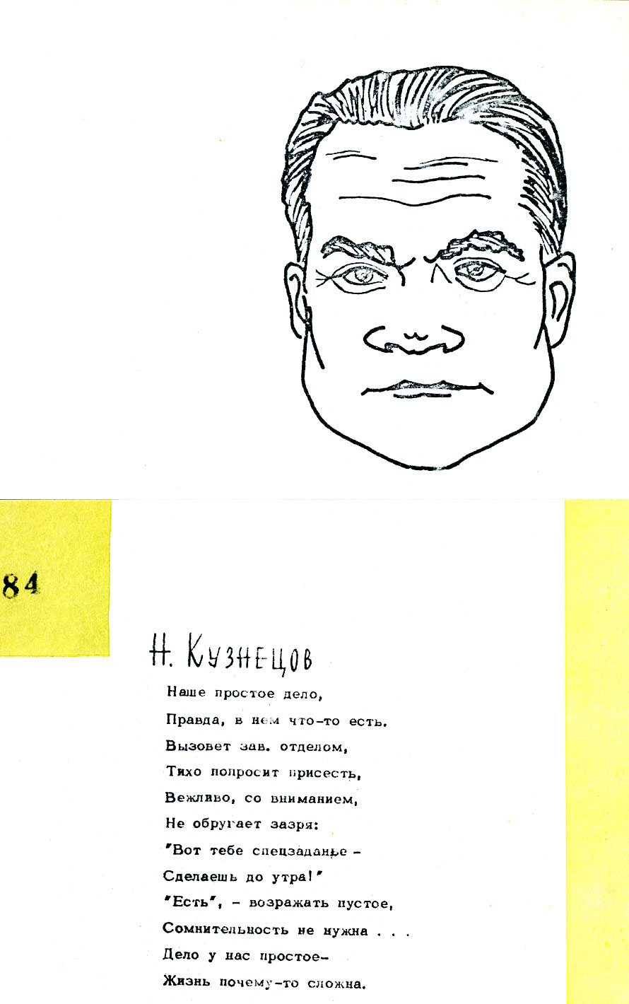 Дружеский шарж Кузнецова Н.Ф. из книги "Музей друзей", изданной научными сотрудниками Института физики Сибирского отделения Академии наук СССР (ИФ СО АН СССР) Олегом Артемьевичем Баюковым и Николаем Сергеевичем Чистяковым. Удивительная книжка дружеских шаржей и эпиграмм на сотрудников Института физики СО АН СССР. Она вышла в 1967 году к 10-летию начала работы института. Вышла небольшим тиражом в 100 экземпляров и распространялась строго по списку, лично в руки. Узнать себя на страницах книги смогли 48 самых ярких и заметных личностей молодого института. Позже (в 1971 году) вышла вторая книга под таким же названием. Что побудило их взяться за такой труд, авторы подробно изложили в предисловии к первой и второй книгам. Книги размещены на сайте.