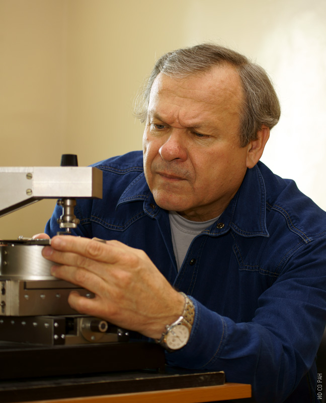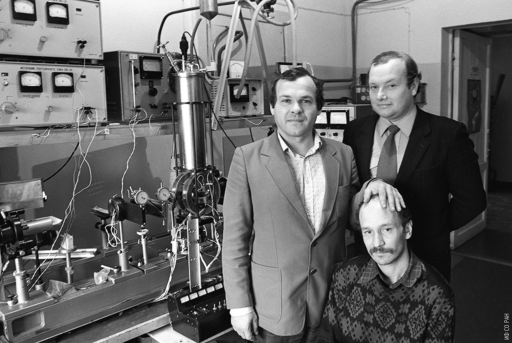 Лексиков Александр Александрович, старший научный сотрудник лаборатории физики магнитных явлений Института физики им. Л.В. Киренского Сибирского отделения Российской академии наук (ИФ СО РАН), создатель установки для исследования магнитооптических и фотомагнитных свойств кристаллов, на которой был обнаружен эффект фотовозбуждения волн намагниченности в кристалле FeBO3 : Ni, за настройкой установки, фото1991 года. Красноярск.