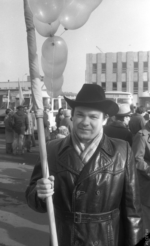 Лексиков Александр Александрович, младший научный сотрудник лаборатории высокочастотных и импульсных свойств тонких магнитных пленок Института физики им. Л.В. Киренского Сибирского отделения Академии наук СССР (ИФ СО АН СССР) на первомайской демонстрации 1982 года. Красноярск.