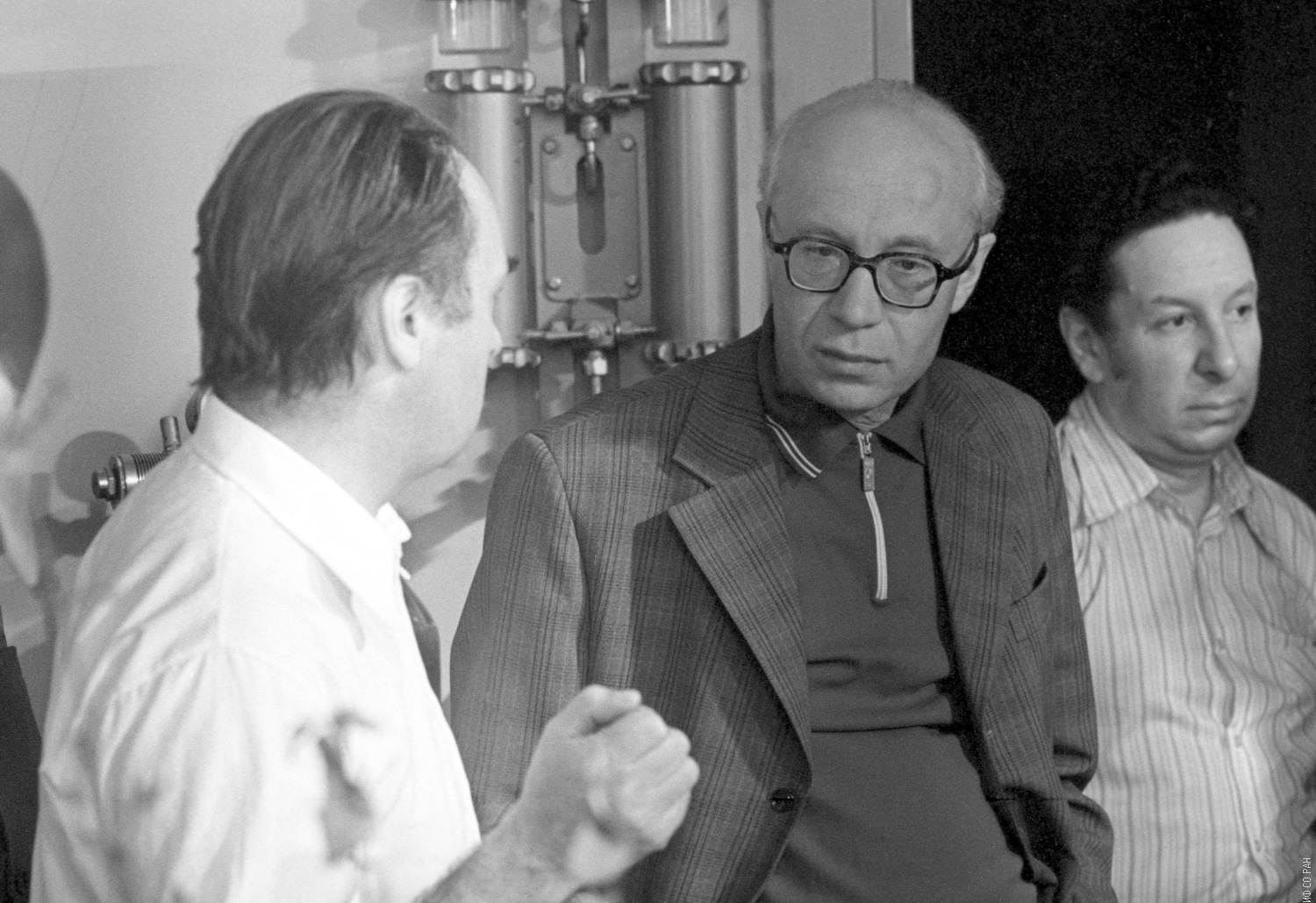 4 ноября 1974 года. Лундин А.Г. (слева), заместитель директора по научной работе, заведующий лабораторией радиоспектроскопии Института физики им. Л.В. Киренского Сибирского отделения Академии наук СССР (ИФ СО АН СССР)