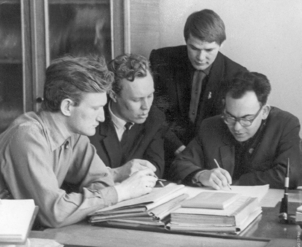Мальцев Вадим Константинович, Хрусталев Борис Петрович, Михайловский Сергей Станиславович, Саланский Нахум Мойшович, заведующий лабораторией (слева направо), сотрудники лаборатории высокочастотных и импульсных свойств тонких магнитных пленок Института физики Сибирского отделения Академии наук СССР (ИФ СО АН СССР), за обсуждением результатов исследований, фото 1967 года. Красноярск.