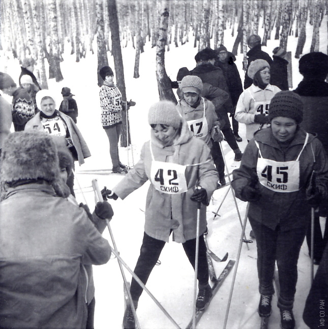 В березовой роще Академгородка проходили соревнования жителей Октябрьского района по лыжам. На фото – болельщики и участники женской сборной команды Института физики им. Л.В. Киренского Сибирского отделения Академии наук СССР (ИФ СО АН СССР). Под номером 17 выступала Мельникова С.В., под номером 45- Жеребцова Л.И., под номером 49 - Грибовская И.В., фото 1974 года. Красноярск.