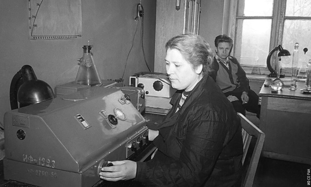 Морева Г. Е., лаборант и Трубачев И.Н., руководитель группы биохимии лаборатории биофизики Института физики Сибирского отделения Академии наук СССР (ИФ СО АН СССР), проводят озвучивание семян гороха на ультразвуковом генераторе. Фото 1968 года. Красноярск.