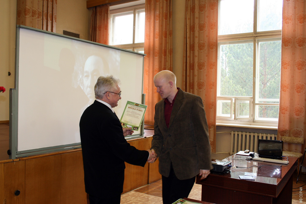 Академик В.Ф.Шабанов, директор Института физики им. Л.В. Киренского Сибирского отделения Российской академии наук (ИФ СО РАН), вручает почетную грамоту победителю ежегодного конкурса-конференции молодых ученых Красноярского научного центра Сибирского отделения Российской академии наук кандидату физико-математических наук А.А. Головне (в 2009 году конкурс был посвящен 100-ию со дня рождения академика Л.В. Киренского), 9 апреля 2009 года. Красноярск.