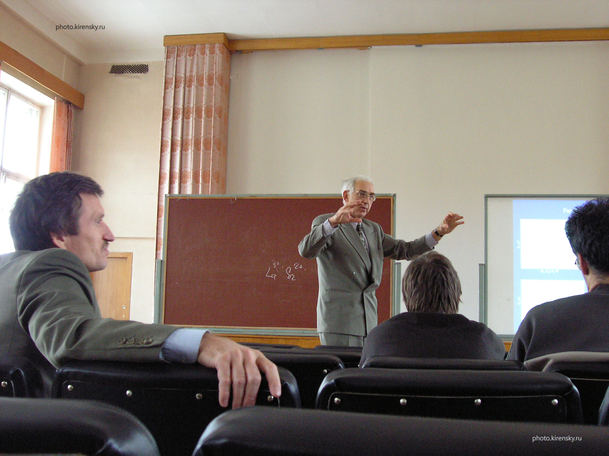 Профессор Овчинников Сергей Геннадьевич (справа), заместитель директора по научной работе, заведующий лабораторией физики магнитных явлений Института физики им. Л.В. Киренского Сибирского отделения Российской академии наук (ИФ СО РАН), "Заслуженный деятель науки Российской Федерации" и Аплеснин Сергей Степанович (слева в первом ряду), доктор физико-математических наук, ведущий научный сотрудник лаборатории теоретической физики Института физики на семинаре в актовом зале института.Красноярск. Снимок 2013 года.