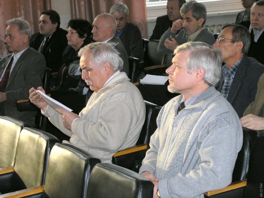 2000 год. На заседании ученого Совета в конференц-зале Института физики им. Л.В. Киренского Сибирского отделения Российской академии наук (ИФ СО РАН). В первом ряду, слева направо: Петраковский Г.А., Исхаков Р.С., Беляев Б.А. Второй ряд, слева направо: Волков Н.В., Александрова И.П., Владимиров В.М., Садреев А.Ф. Третий ряд, слева направо: Панкрац А.И., Зобов В.Е. На заднем плане: Лексиков А.А. (старший), Патрин Г.С. Красноярск.