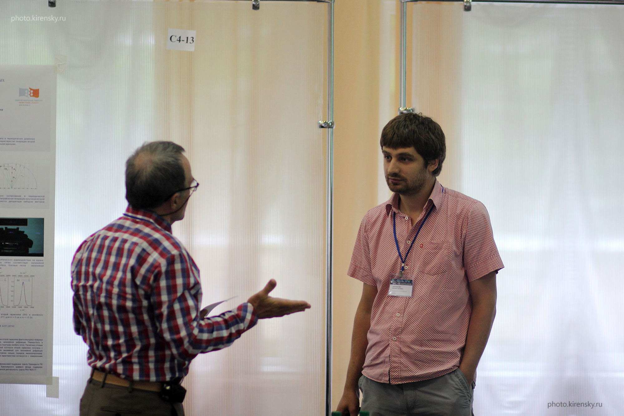 Павловский Максим Сергеевич (справа), старший научный сотрудник лаборатории кристаллофизики Института физики им. Л.В. Киренского Сибирского отделения Российской академии наук на XX Всероссийской конференции по физике сегнетоэлектриков (ВКС-XX), состоявшейся 18-22 августа 2014 года в Красноярске