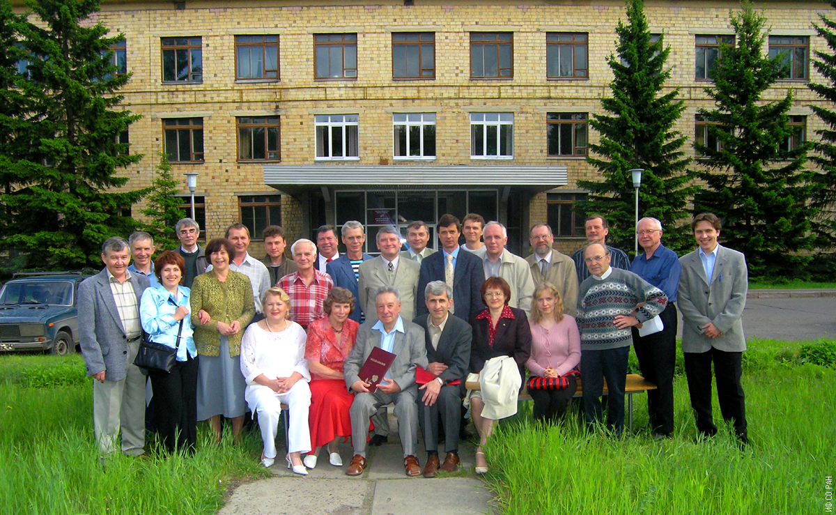 Участники встречи, посвящённой 40-летию создания лаборатории радиоспектроскопии Института физики им. Л.В. Киренского Сибирского отделения Российской академии наук (она создана в 1965 году). Сидят (слева направо): В.С. Абакумова, С.Э. Лупинина, А.Г. Лундин, В.Е. Зобов, М.И. Никитина, Т.О. Кухлевская. Стоят (слева направо): В.В. Меньшиков, А.К. Савин, А.Б. Подмаркова, А.М. Кармишин, Э.А. Петраковская, С.А. Трофимов, А.А. Кузнецов, А. Симонов, Ю.И. Геллер, А.В. Пономаренко, М.М. Кучеров, Е.А. Вопилов, Ю.Н. Иванов, А.Н. Мацулёв, М.А. Попов, С.П. Прозоров, А.А. Суховский, В.М. Кудря, О.В. Фалалеев, А.С. Кожура. Фото 2005 года, Красноярск.