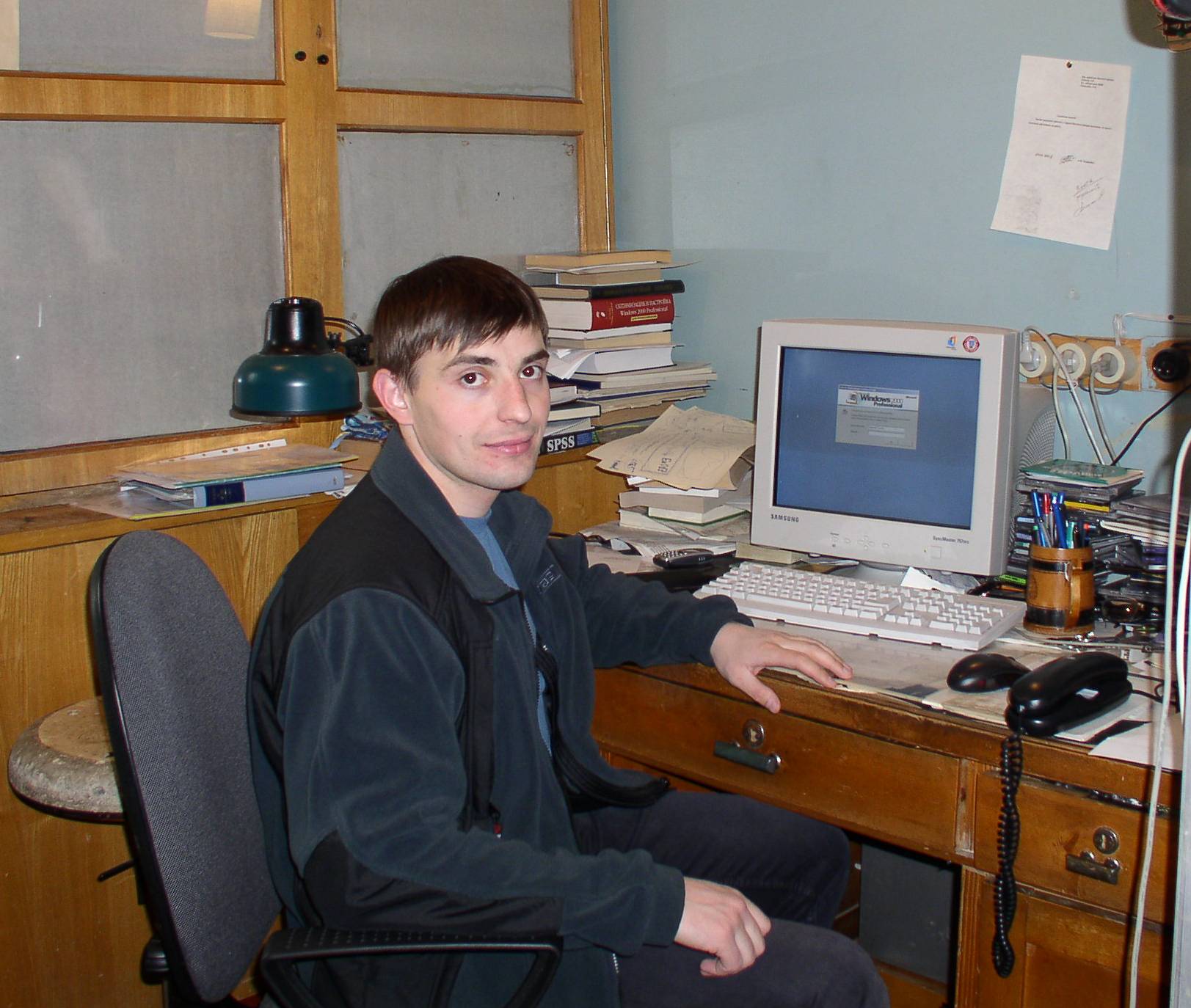 Поцелуйко Андрей Михайлович, научный сотрудник лаборатории физики магнитных явлений Института физики им. Л.В. Киренского Сибирского отделения Российской академии наук (ИФ СО РАН). Фото 2004 года. Красноярск.