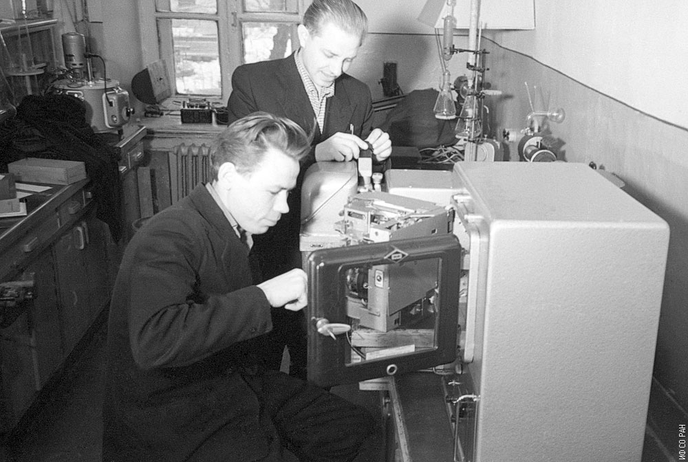 Бондарев А.Ф. (слева) и Русецкий Ю.С, сотрудники лаборатории молекулярной спектроскопии Института физики Сибирского отделения Академии наук СССР (ИФ СО АН СССР), у спектрометра ДФС-12. Фото 1965 года. Красноярск.