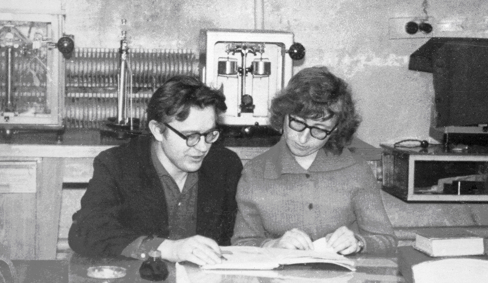 Василий Николаевич Селезнев и Клара Александровна Саблина, сотрудники лаборатории магнитных материалов Института физики Сибирского отделения Академии наук СССР (ИФ СО АН СССР), анализируют результаты очередного эксперимента. Снимок 1967 года. Красноярск.