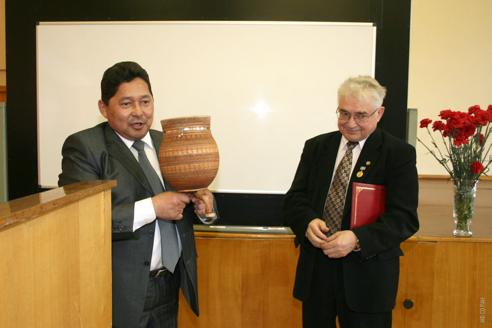Глава муниципального образования «Амгинский улус» (район)» Республики Саха (Якутия) А.Е.Артемьев вручает памятный сувенир администрации Амгинского улуса директору Института физики им. Л.В. Киренского Сибирского отделения Российской академии наук (ИФ СО РАН) академику В.Ф. Шабанову, 9 апреля 2009 г.