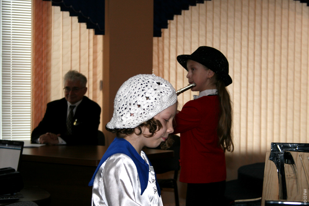 После торжественного заседания, посвященного 100-летию со дня рождения академика Л.В.Киренского, организатора и первого директора Института физики им. Л.В. Киренского Сибирского отделения Российской академии наук (ИФ СО РАН), в Доме ученых Красноярского научного центра СО РАН выступили учащиеся детской музыкальной школы № 11 Академгородка. На снимке: Катя Зайцева (флейта) и Лада Емельянова (фортепиано). Слева, В.Ф. Шабанов, председатель Президиума Красноярского научного центра Сибирского отделения Российской академии наук (СО РАН), директор Института физики им. Л.В. Киренского СО РАН, 9 апреля 2009 года.