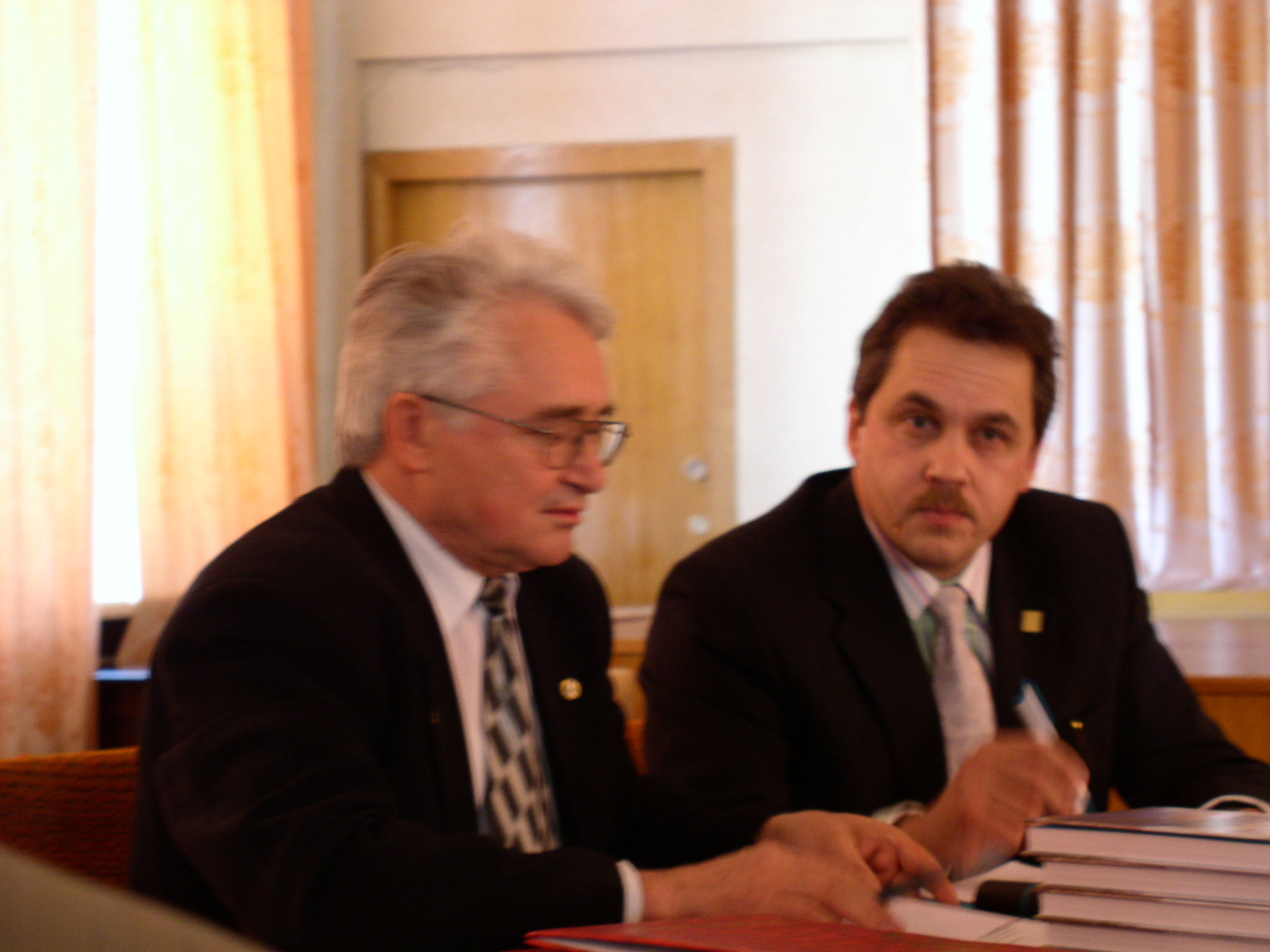 Директор Института физики им. Л.В. Киренского Сибирского отделения Российской академии наук (ИФ СО РАН) академик Шабанов Василий Филиппович (справа) и заведующий лабораторией магнетизма горных пород института Звегинцев Анатолий Георгиевич, на заседании ученого Совета института. Снимок 2005 года. Красноярск.