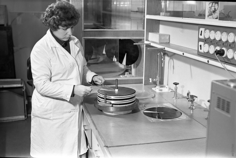 Шульгина Татьяна Васильевна за сборкой галетного биттеровского соленоида с клееными дисковыми обмотками. Технология таких обмоток разработана в институте в 1984 году. Фото 1986 года.